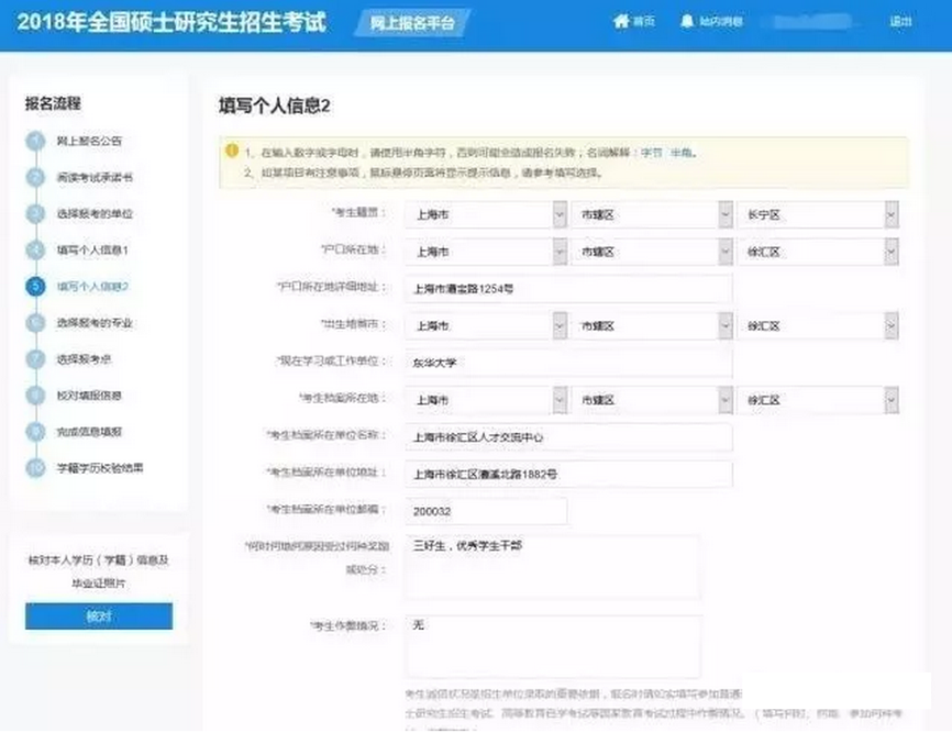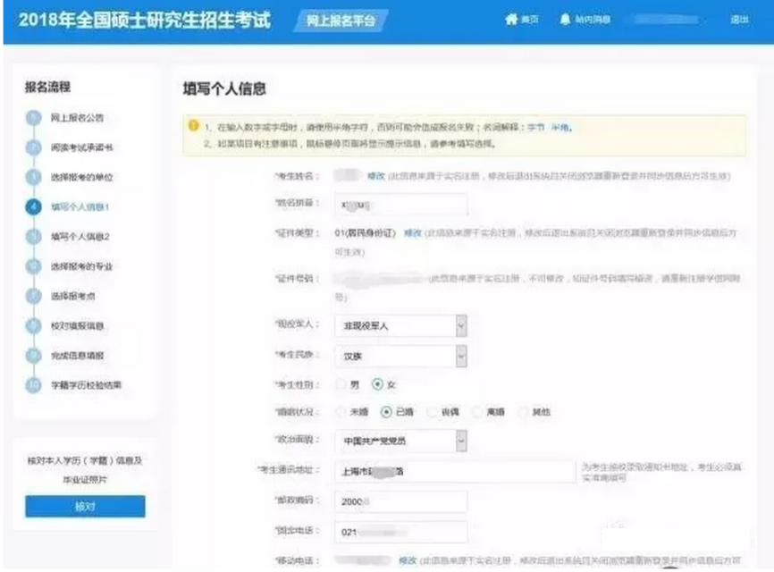 Tip:网上报名期间,考生可自行填报、修改或重新填报报名信息,但一位考生只能保留一条有效报名信息。如需重新填报报名信息(新增报名),须取消已有的报名,已取消的报名信息不可用于现场确认。报名过程中如需修改信息,建议退出网上报名系统,重新登录修改。现场确认前,考生可查看及下载网上报名信息。预报名为有效数据。请按教育部、省级教育招生考试机构、报考点以及招生单位的网报公告要求报名。逾期不再补报,也不得再修改报名信息。