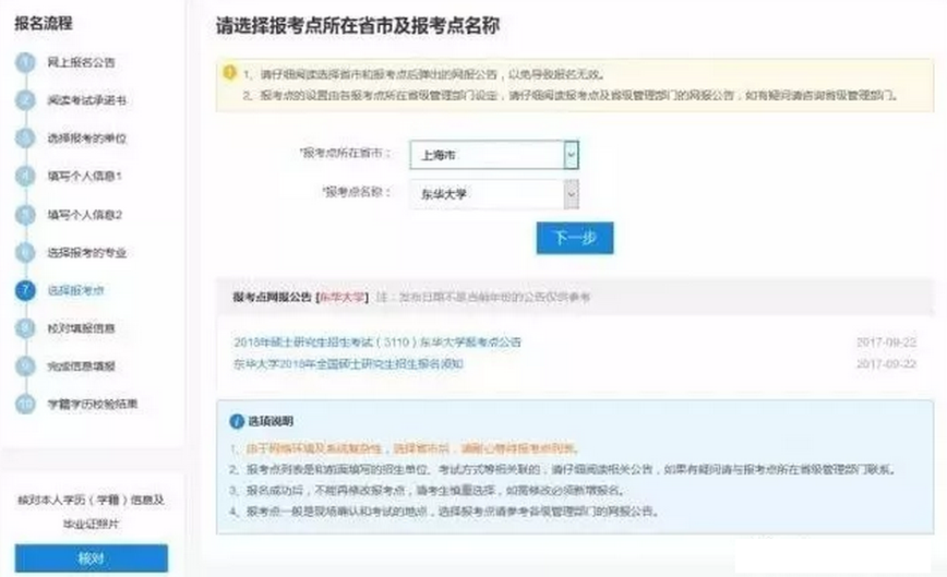 Tip:考生网上报名时必须选择就读高校或户口、工作所在地省市教育考试管理机构指定的报考点。各省市的报考点安排可在省市招办和报名点的报名公告中查看(//yz.chsi.com.cn/sswbgg/),或咨询所在地省市招办。
