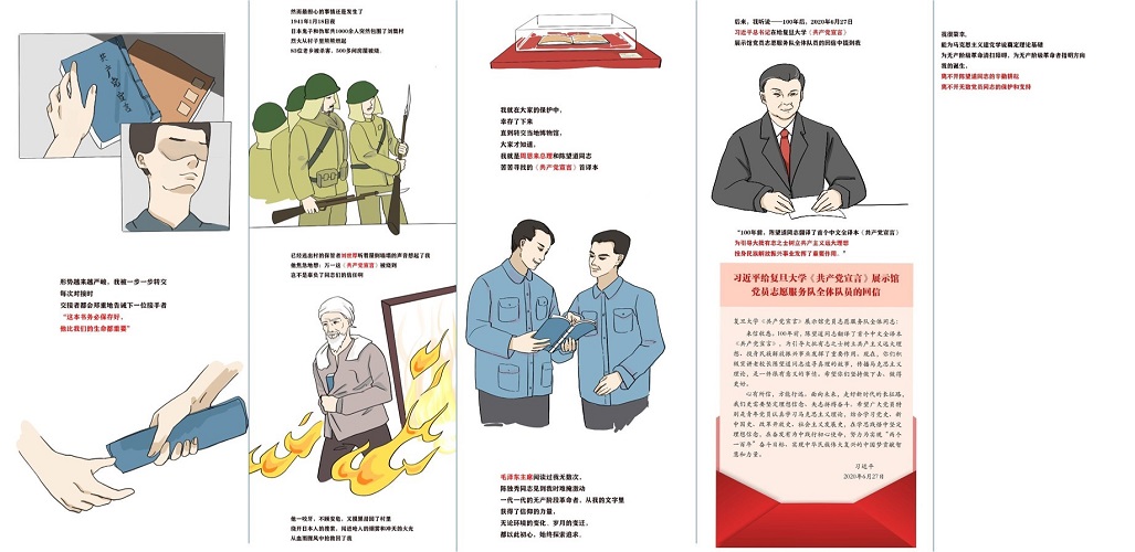 沉浸体验课。充分发挥红色文化基地的溢出效应,将红色文化基地变成党史学习教育的实景课堂。组织学生党员寻访中共一大会址、中共二大会址、毛泽东故居、中国劳动组织书记部旧址陈列馆等红色文化基地,开展《寻访申城红色印记,铺就文物“复兴”之路》专题实践,聚焦上海革命文物的宣传和保护,设计《文物有话说》绘本、录制《文物的前世今生》纪录片、《行红途,承脊梁》创意视频,让学生党员在行走中学党史、在学党史中弘扬革命文化,做好革命文物的传播者和实践者。