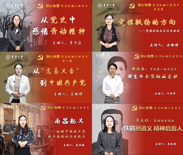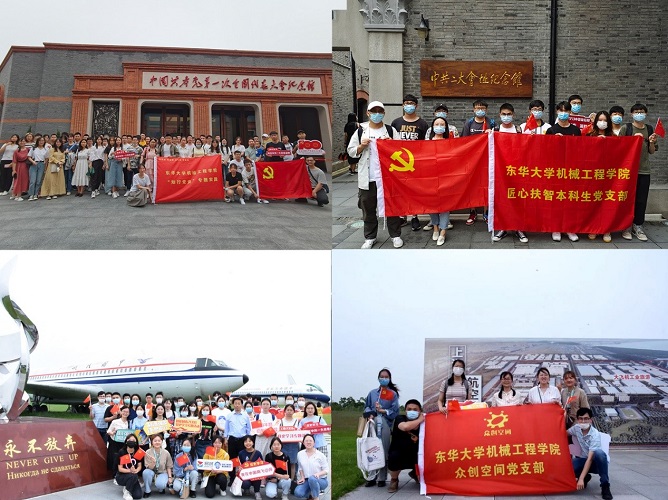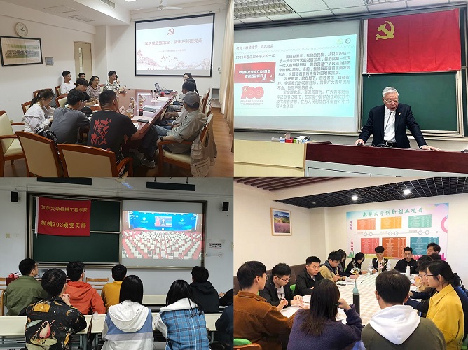 创意互动课。组织学生党员从党的百年风雨、百年奋斗、百年辉煌和奋进新时代的滚滚历史洪流中,从以奋进之东华筑梦祖国的时代目标中,汲取营养,激发灵感,创作讴歌党、讴歌祖国、讴歌社会主义的艺术作品。筑梦创设研究生党支部以22幅创意海报描绘党的百年奋斗征程,举办“从一大到十九大:千秋伟业,百年芳华”创意设计展览;智能制造党支部运用VR技术打造实境课堂,赋能党史学习教育“科技味”,引领师生穿越百年风雨,见证中国共产党带领中国人民不懈奋斗的光辉历程,镌刻百年初心。