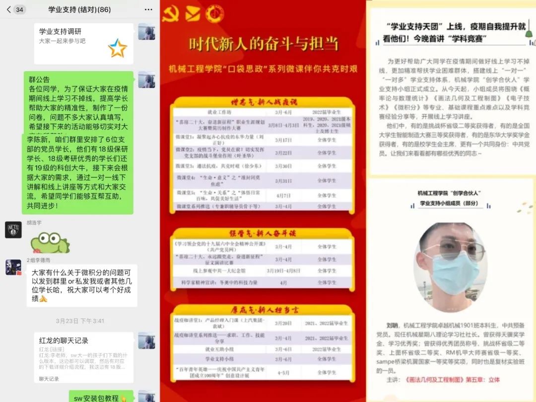 为了确保在线学习的质量,支部党员全员加入学院“创学合伙人”的队伍中,成立学业支持小组,为同学们办实事、解难题,针对不同年级学生面临困难以“云”助力的方式守护学业第“疫”线。支部精心制作学业支持问卷,调研线上课程出现的问题和困惑,梳理框架并制作“口袋课堂”课程,搭建线上“一对一”“一对多”学业支持体系,从专业前景、课程学习、学科竞赛多方面助力同学们疫情期间的自我提升。目前,党员沈航已为低年级同学开展了一期“学科竞赛”讲座,刘聃等十四位党员担任主讲录制了第一阶段的八份线上微课,在战“疫”学习路上用匠心与同学们共奋进!