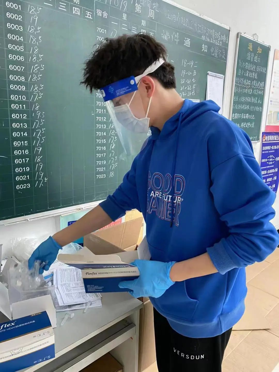 他自学校实施宿舍网格化管理以来担任六层层长,负责人员信息统计,一日三餐,抗原检测试剂和物资的发放。同时监督着每个寝室及时上传核酸和抗原检测结果的照片。在这一个月的志愿工作中,他深刻体会到防疫工作者的辛苦,但同时他也感受到同学、老师、宿管阿姨和校内后勤人员的团结一心,大家都在相互理解,都在用自己的方式为抗疫做贡献。
