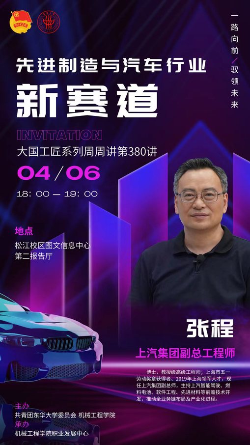 讲座将结合个人成长、奋斗经历展开分享,用奋进故事的形式介绍主讲人领衔及主要参与的行业案例,主要有:(1)上汽集团“最后一公里”自主泊车项目;(2)上汽-同汶智能网联测评基地及智能网联测评体系;(3)整车智能驾驶关键技术的开发与测评体系;(4)上汽荣威950然料电池轿车所涉技术等。