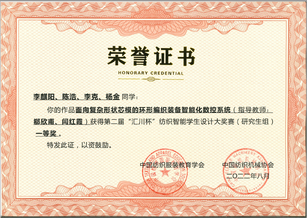 近日,第二届“汇川杯”纺织智能学生设计大奖赛获奖名单公布。经过专家评审和现场答辩,成人影视片 研究生李麒阳、陈浩、李克和杨金完成的团队作品《面向复杂形状芯模的环形编织装备智能化数控系统》(指导教师:郗欣甫、闫红霞)荣获总决赛(研究生组)一等奖。