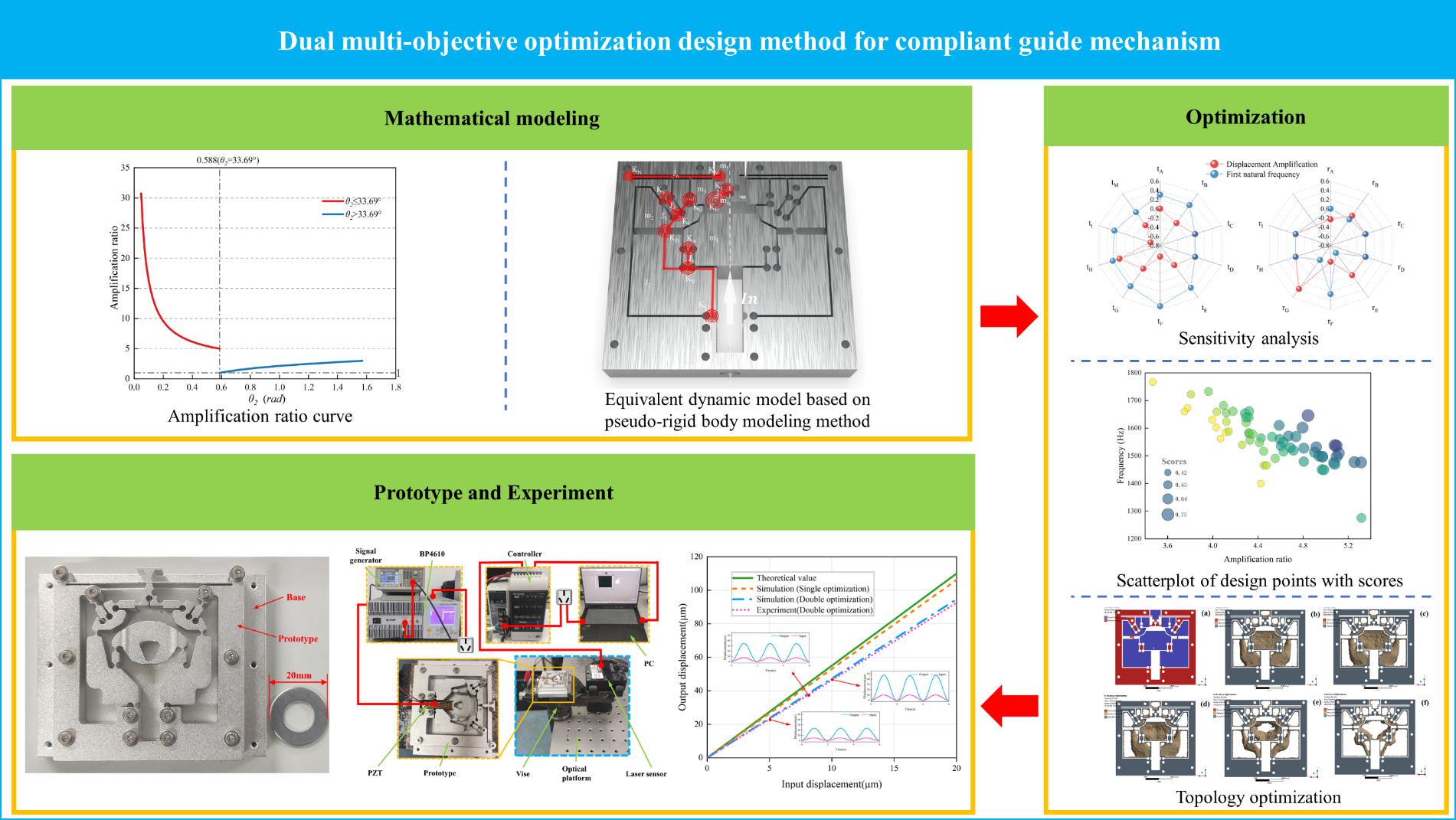 柔顺机构具有精度高、重量轻、易加工、无摩擦、无需润滑等特点,通过弹性构件的挠曲变形实现微纳米位移的精准传递,在超精密作业中扮演重要角色,目前已在精密光学、细胞操纵、可控核聚变、太空探测等高精尖领域得到应用。课题组团队通过构建柔顺机构优化设计新方法,提出了双重多目标优化设计流程,并以“Dual multi-objective optimization design method for compliant guide mechanism”为题发表于国际期刊Structural and Multidisciplinary Optimization(IF: 3.9, JCR Q1),成人影视片