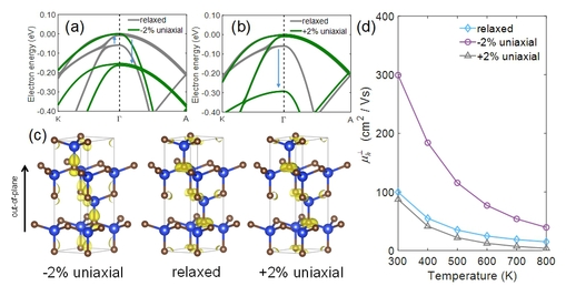 4H-SiC因其高巴利加优值在功率芯片、国防与航天等领域具有巨大潜力。然而,4H-SiC相对较低的空穴迁移率严重限制了其在互补式金属氧化物半导体和高功率转换设备等应用中的发展。因此,迫切需要开发实用的方法来提高4H-SiC的空穴迁移率。本研究通过对4H-SiC的空穴迁移率进行模态级的第一性原理计算,发现其较低的空穴迁移率根源在于声学声子引起的空穴带间散射。通过施加单轴压缩应变可以反转价带顶的电子能带顺序(图一),将自旋分裂能带向能带边缘抬升并产生较大的能带间隙。因此,能带间电子-声子散射得以显著抑制,空穴群速度也明显增加,二者的协同效应使得4H-SiC的空穴迁移率在2%的单轴压缩应变下增加约200%。本研究为4H-SiC中的电子输运机制提供了深入理解,所提出的调控策略有望用于4H-SiC基功率芯片的实际制备,研究结论可以进一步扩展到其他具有六方晶体结构的半导体。
