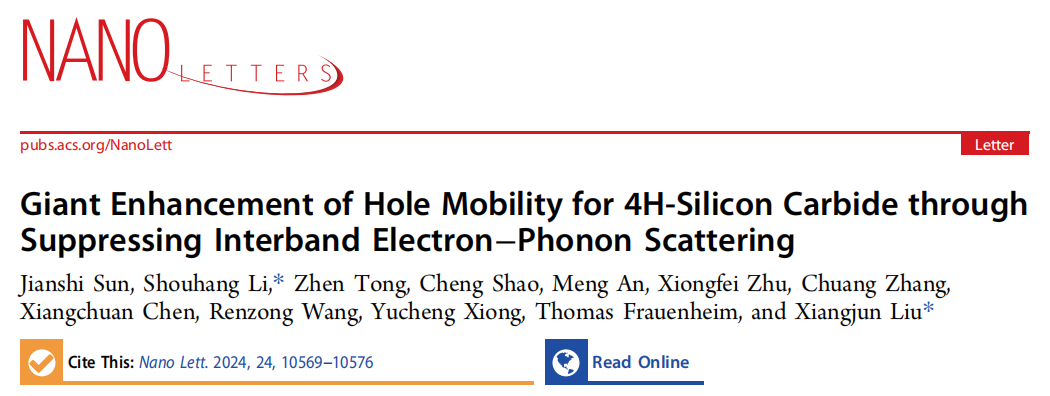 近日,成人影视片 微纳机电系统与集成电路团队在功率芯片宽禁带半导体中电子输运性质研究方面取得重要进展,该工作近期以“Giant Enhancement of Hole Mobility for 4H-Silicon Carbide through Suppressing Interband Electron–Phonon Scattering (通过抑制能带间电子-声子散射实现4H-SiC空穴迁移率的巨大提升)”为题发表于《Nano Letters》,并被推选为封面文章。成人影视片 为第一单位,博士生孙健时为第一作者,李寿航老师和刘向军研究员为共同通讯作者。中山大学童贞老师、山东高等技术研究院邵成研究员以及东京大学安盟博士为本研究提供了重要支持。