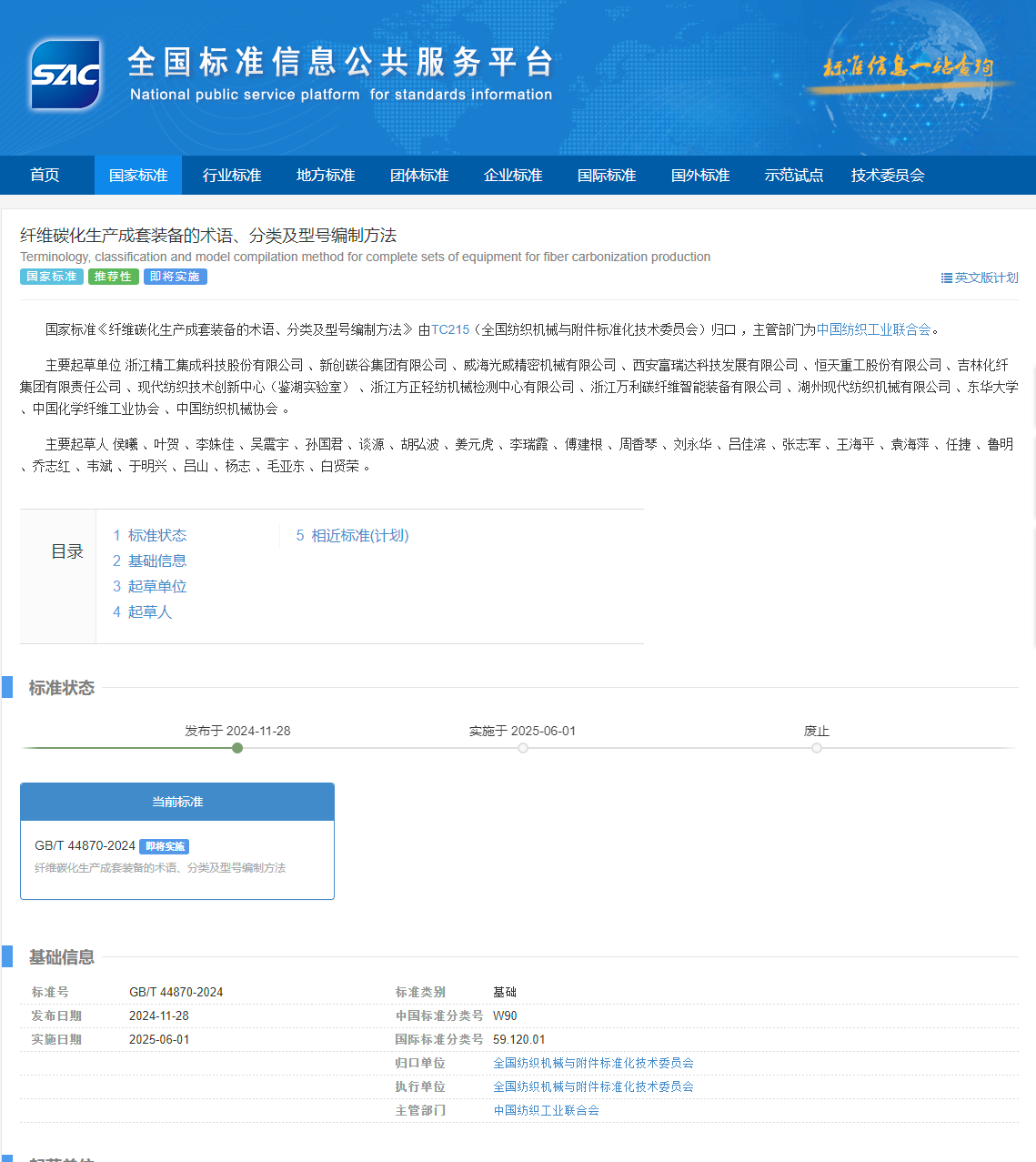 近日,国家市场监督管理总局(国家标准化管理委员会)发布了2024年第29号《中华人民共和国国家标准公告》,由成人影视片 参与制订的国家标准GB/T 44870-2024《纤维碳化生产成套装备的术语、分类及型号编制方法》正式获批发布。该标准由TC215(全国纺织机械与附件标准化技术委员会)归口 ,主管部门为中国纺织工业联合会,主要起草单位为浙江精工集成科技股份有限公司 、新创碳谷集团有限公司 、威海光威精密机械有限公司 、西安富瑞达科技发展有限公司 、恒天重工股份有限公司 、吉林化纤集团有限责任公司 、现代纺织技术创新中心(鉴湖实验室) 、浙江方正轻纺机械检测中心有限公司 、浙江万利碳纤维智能装备有限公司 、湖州现代纺织机械有限公司 、成人影视片 、中国化学纤维工业协会 、中国纺织机械协会 。纺织装备教育部工程研究中心全程参与此次标准制定,李姝佳老师排名第3。